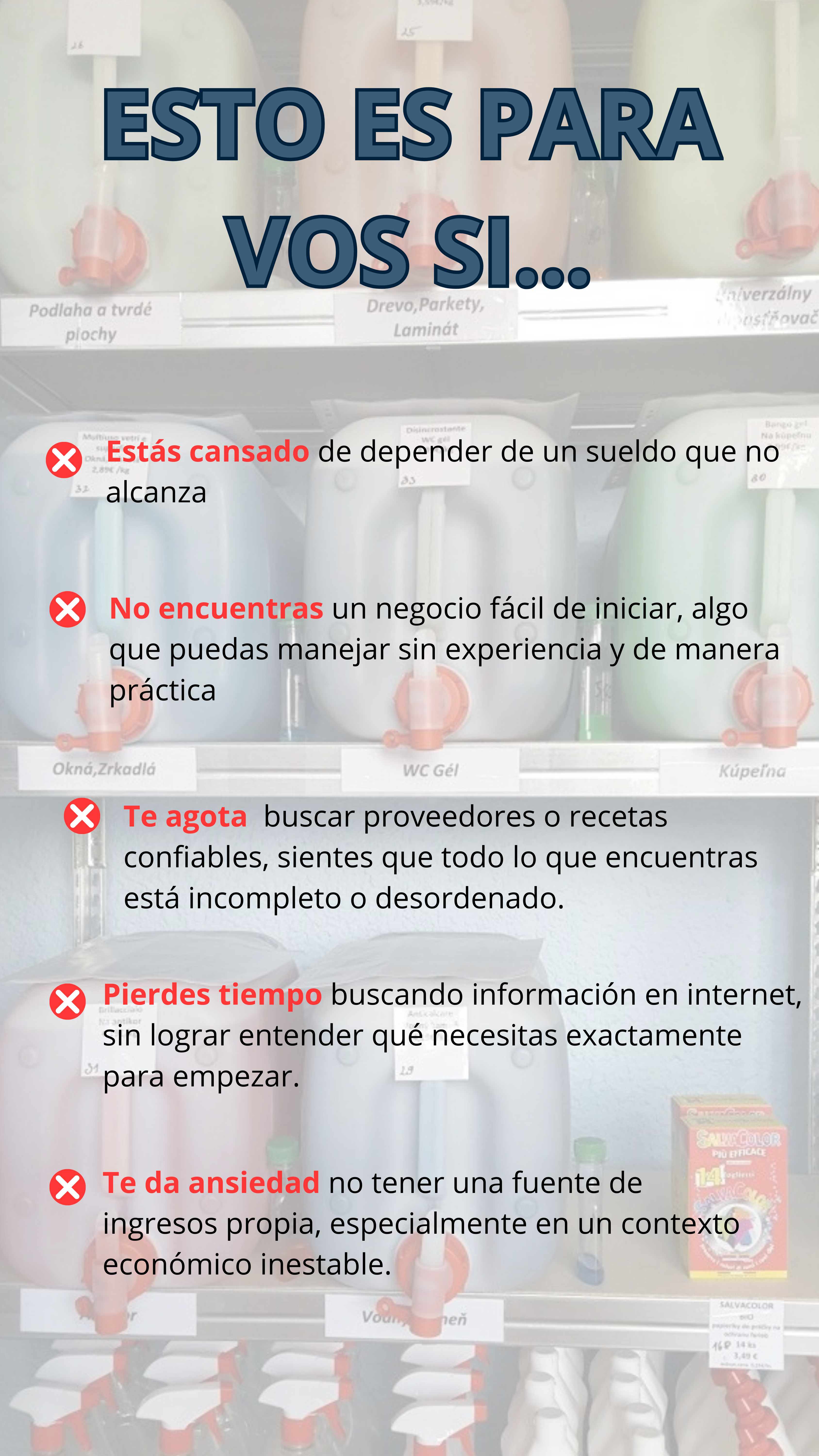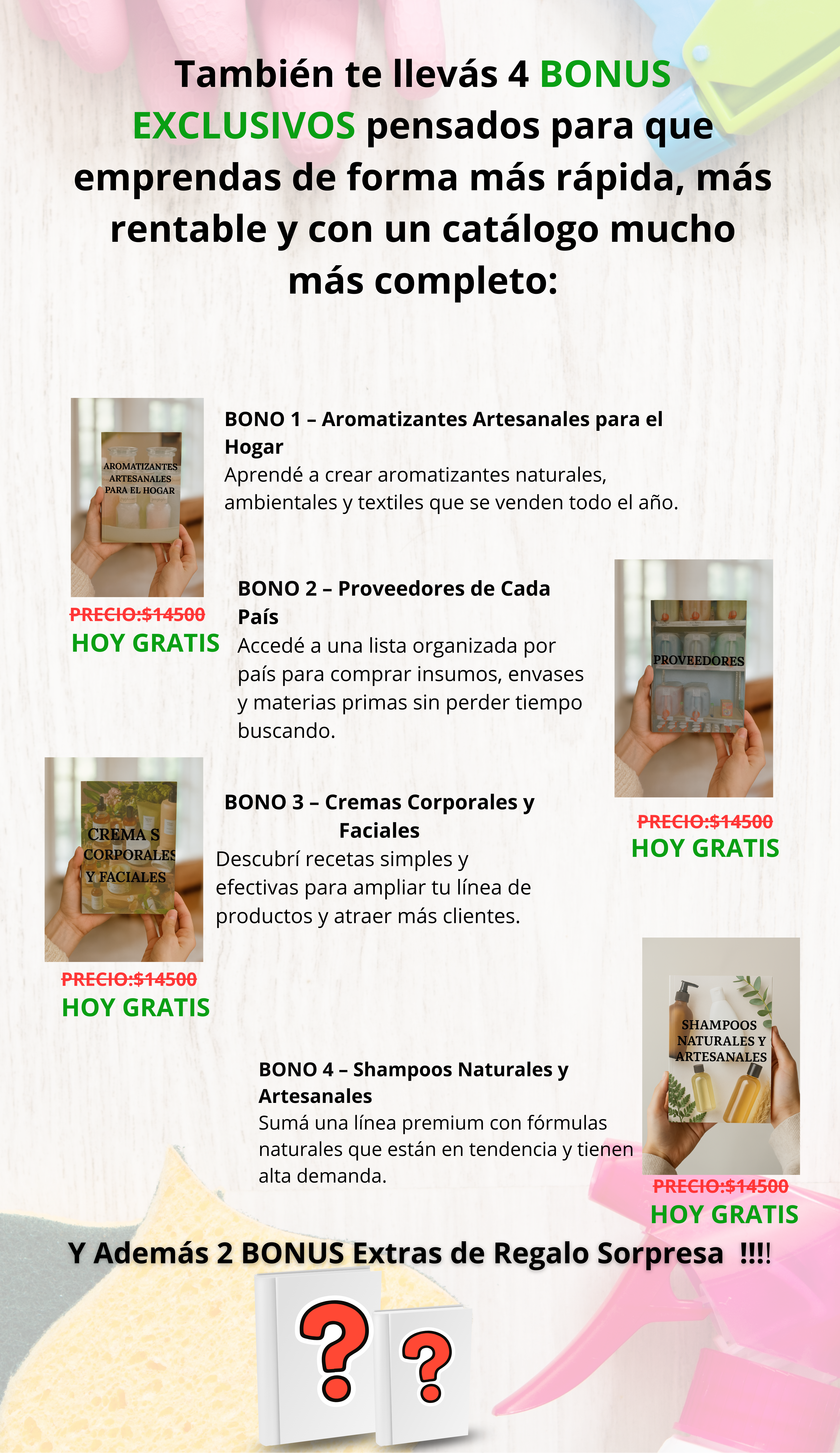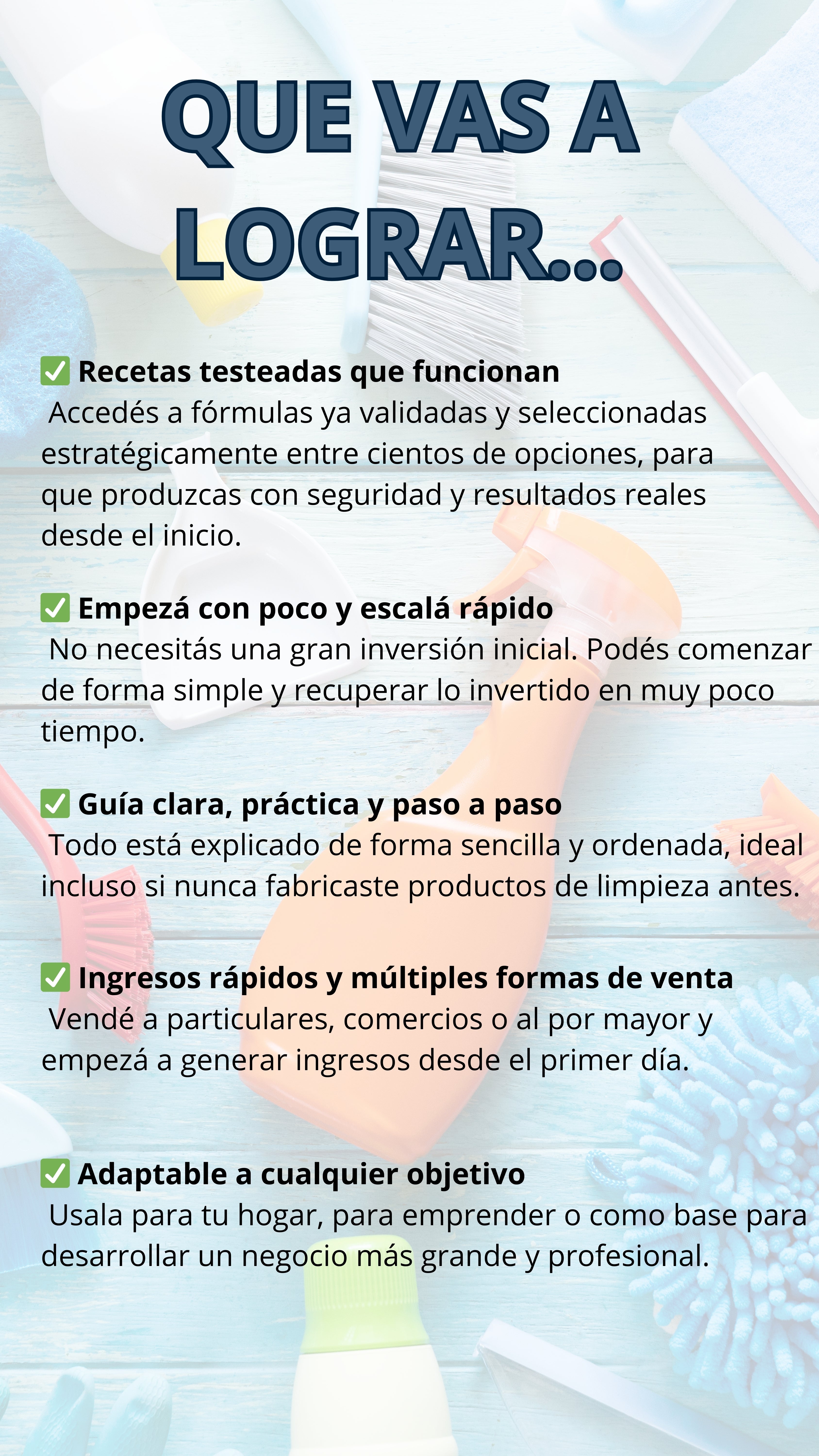 Vas a aprender a fabricar productos de limpieza funcionales y listos para vender, además de acceder a fórmulas adicionales y herramientas para emprender gracias a los bonus incluidos.